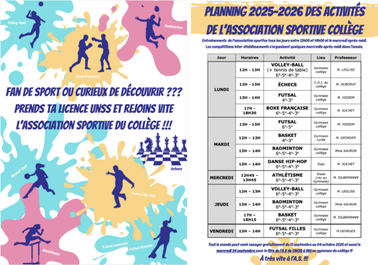 Par Administrateur honoredurfe, publié le lundi 1 septembre 2025 18:22 - Mis à jour le jeudi 4 septembre 2025 19:05Présentation du fonctionnement de l'Association Sportive du collège. -